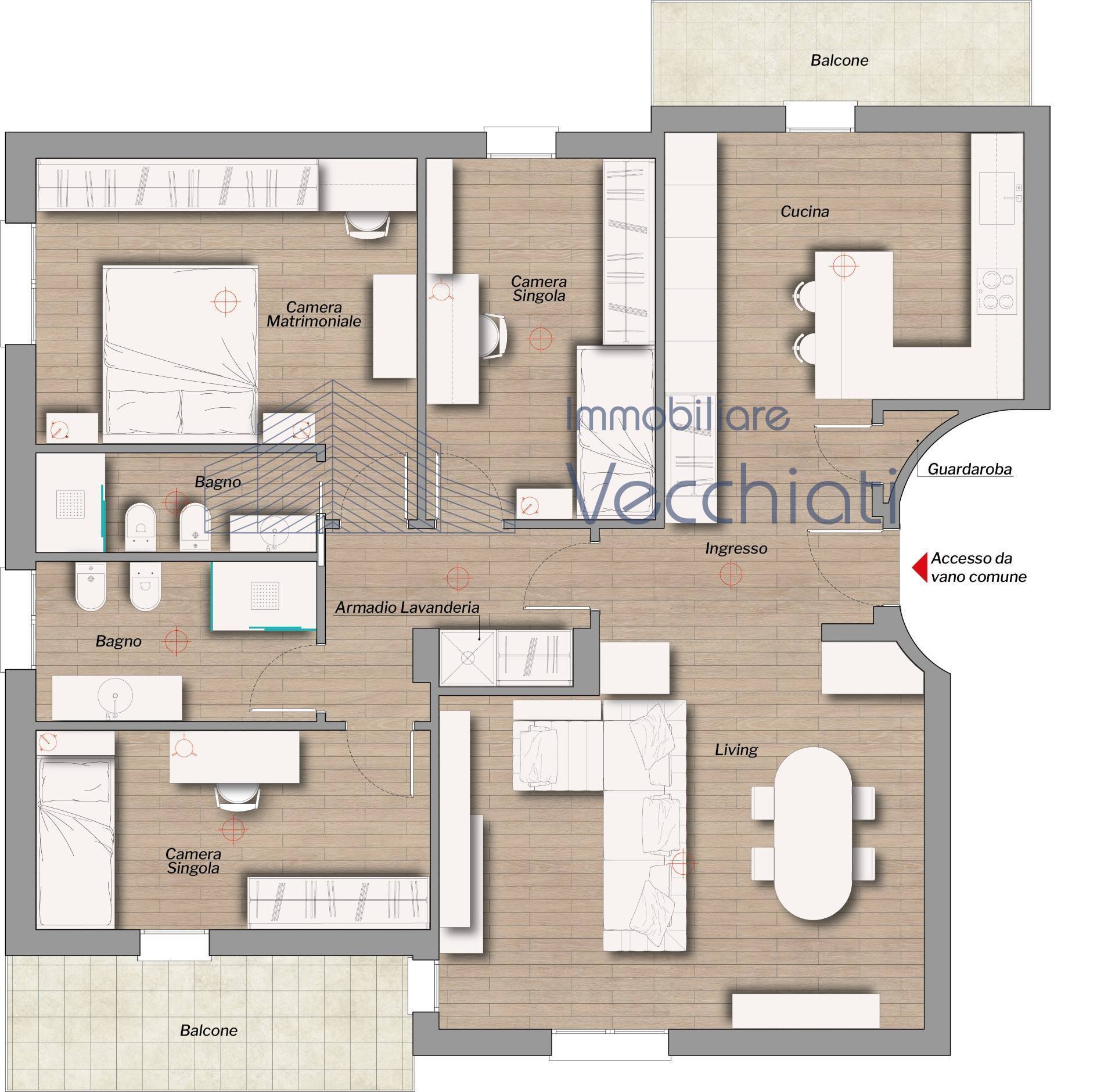 L'Appartamento è composto da ingresso, soggiorno grande con terrazzo, ripostiglio, cucina abitabile con terrazzo, 3 camere di cui un con bagno privato, bagno grande, nel disimpegno attacchi per la lavatrice.