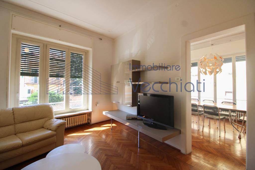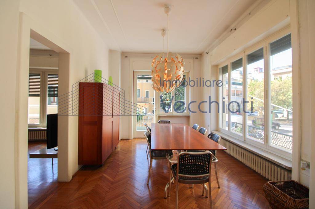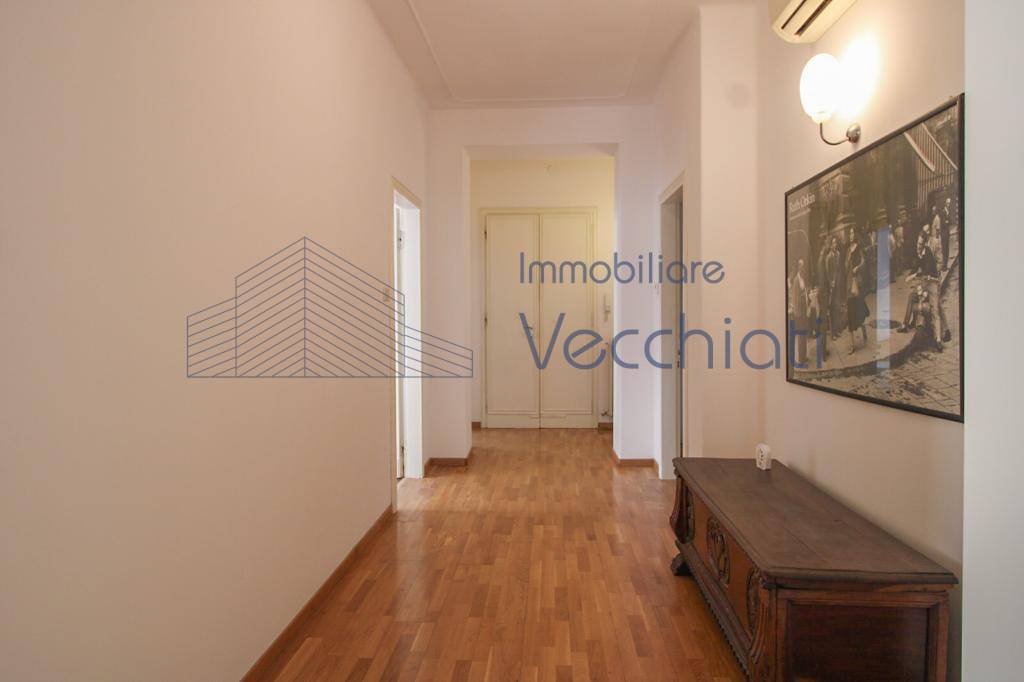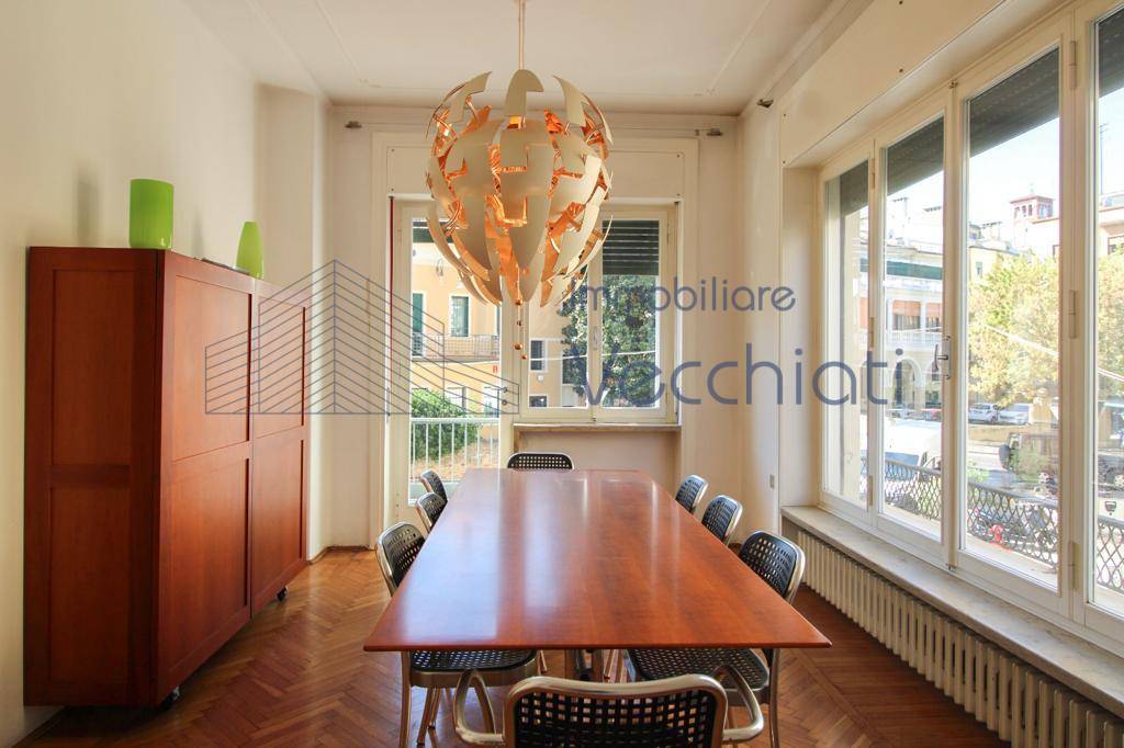 L'Appartamento è ricco di ampie finestre, spazi nobiliari e altezze generose; la disposizione interna divisa in cucina, pranzo e soggiorno, 4 camere matrimoniali, 2 bagni, studio e una terrazza verandata adibita a zona lavanderia. Cantina al piano mezzano.